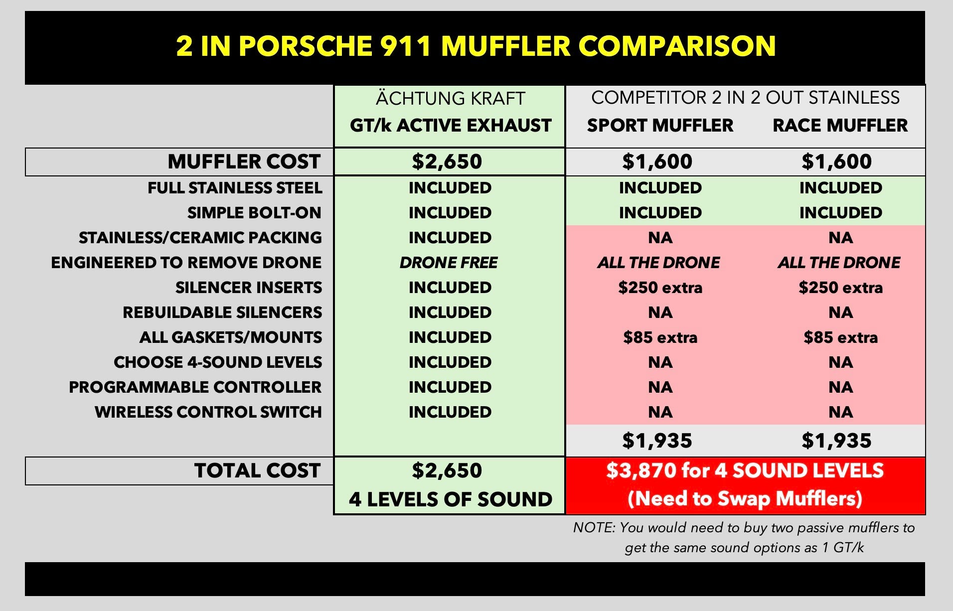 The GT/k Active Muffler from Achtung Kraft – Engineered to bring the right sound and tone to any air-cooled Porsche and delivers a drone-free driving experience. The perfect addition to your classic Porsche. This high-performance muffler is designed to optimize your Porsche's performance using the latest active muffler technology, while retaining the classic air-cooled Porsche sound that you know and love. Its active valve system allows you to adjust the exhaust note, giving you a deep, rich tone when closed, and an aggressive race car-inspired sound when opened. It's the ultimate way to enhance your Porsche's performance without sacrificing its iconic sound